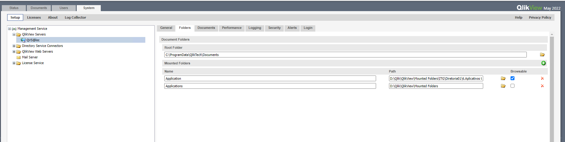 Caminho para validação das pastas: QMC > System > Setup > Management Service > QlikView Server > Nome do servidor > Folders: